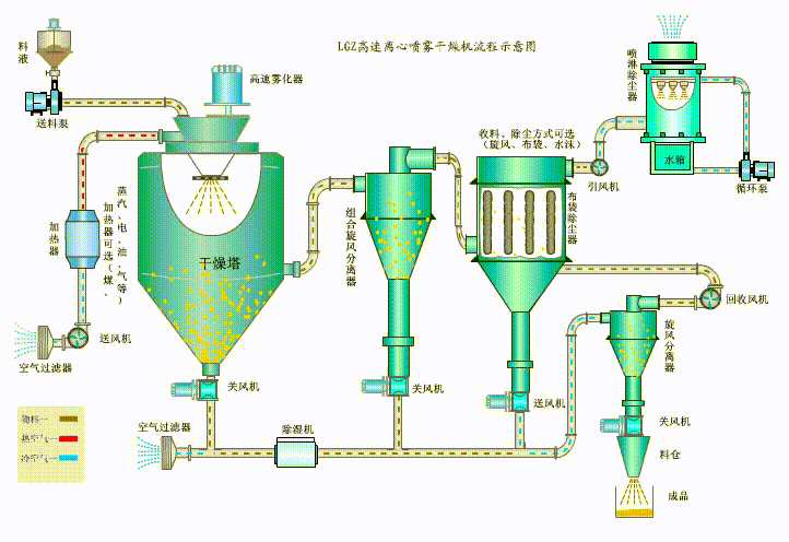 空氣經(jīng)過濾和加熱,進入干燥器頂部空氣分配器,熱空氣呈螺旋狀均勻地進入干燥室。料液經(jīng)塔體頂部的高速離心霧化器,(旋轉(zhuǎn))噴霧成細微的霧狀液珠,與熱空氣并流接觸在短的時間內(nèi)可干燥為成品。成品連續(xù)地由干燥塔底部和旋風(fēng)分離器中輸出,廢氣由引風(fēng)機排空。